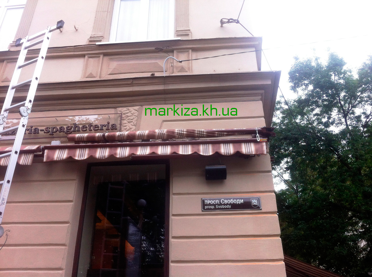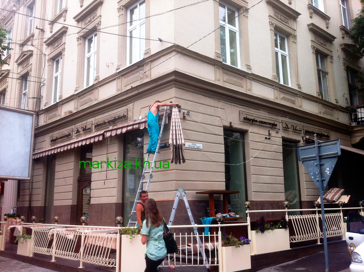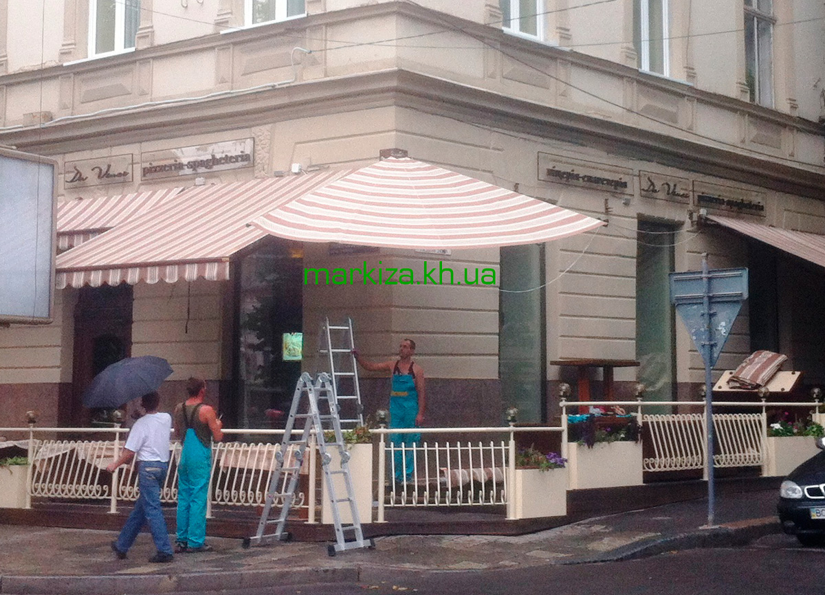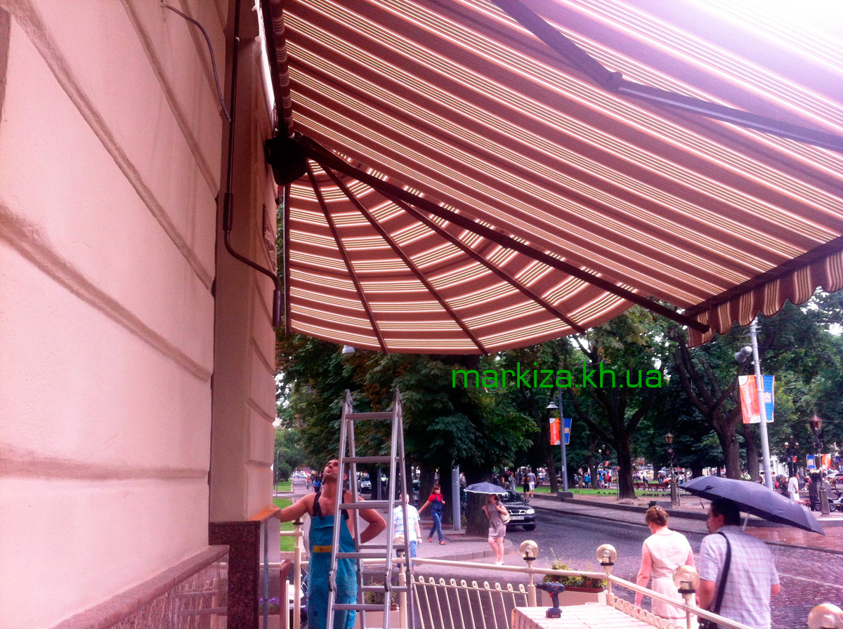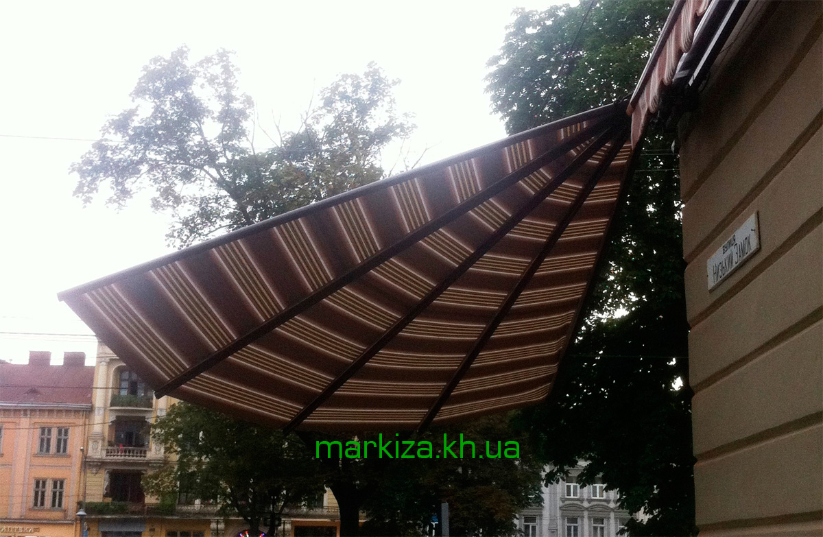 Радиусная маркиза имеет радиус веера от 3,0 до 4,5м, может поворачиваться вокруг своей оси на 270°, а также позволяет плавно регулировать угол наклона от горизонтального до вертикального положения, в зависимости от варианта исполнения системы. Четыре тканевых сегмента веера зафиксированы специальными направляющими профилями. Система изготавливается из высококачественных материалов, таких как хромированная сталь и покрытый порошковой краской алюминий.
